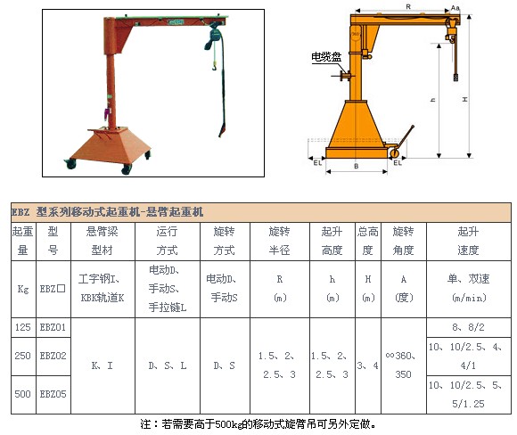 EBZ型系列移動(dòng)式起重機(jī)由于這種移動(dòng)式旋臂起重機(jī)很容易適合新的要求,按照工作場(chǎng)所的重新布置,是需要經(jīng)常變換工作場(chǎng)所的理想選擇方案,可移動(dòng)式旋臂吊特別適合維修或需要經(jīng)常變化的工作。
